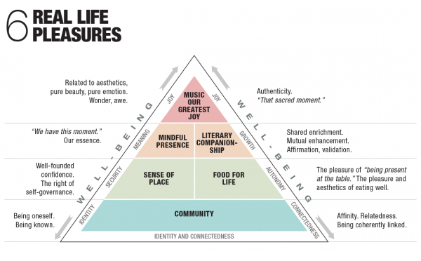 Well-being pyramid illustrating hierarchy of “6 Real Life Pleasures.” Adapted by ABeautifulVoice.org. Adapted from Dementia Beyond Disease, Enhancing Well-Being – Revised Edition, (p. 99), by G. Allen Power, MD, FACP (2017).